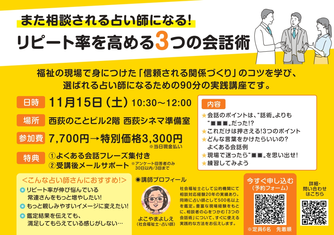 この講座では、社会福祉士として20年以上にわたり、さまざまな相談を受けてきた経験と、占い師として500名以上を鑑定してきた実績をもとに、相談者の心をつかむ3つの会話術を学びます。